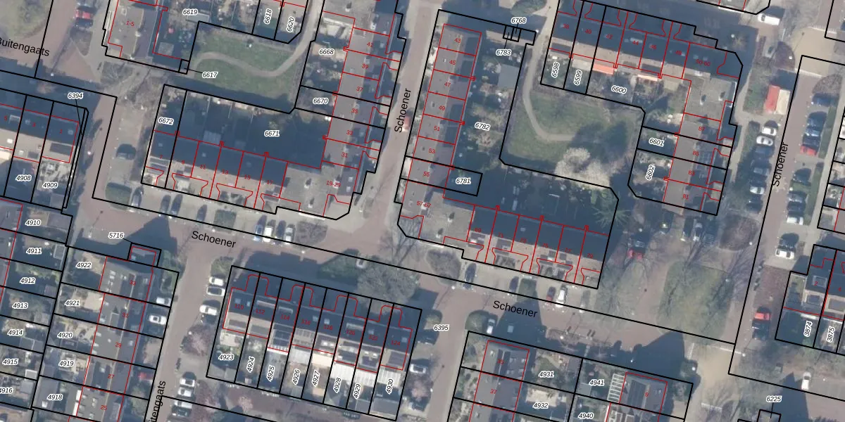 Het perceel waarop Schoener 67 staat heeft een oppervlakte van 1770 m². Dit is een zeer groot perceel. De perceeloppervlakte wordt geregistreerd door het Kadaster. Gedetailleerde informatie over de maten van dit perceel kunt u vinden in het rapport Kadastrale kaart met maatvoering van Schoener 67.