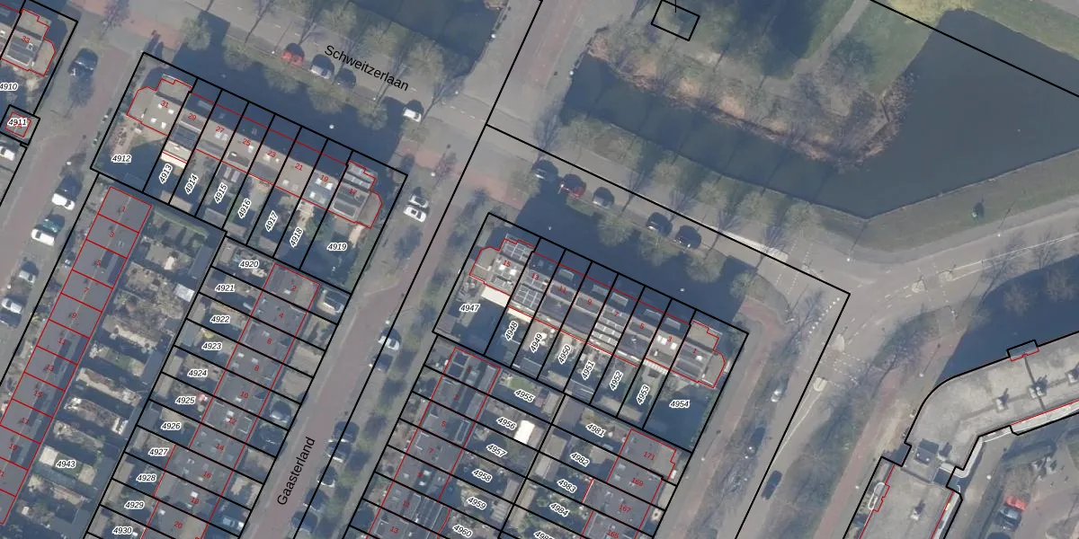 Schweitzerlaan 13 is gelegen op kadastraal perceel ASV00O4948. Deze kadastrale aanduiding is uniek en wordt gebruikt door het Kadaster om eigendomsrechten en andere zakelijke rechten vast te leggen. Het perceel maakt onderdeel uit van de kadastrale gemeente Amstelveen.