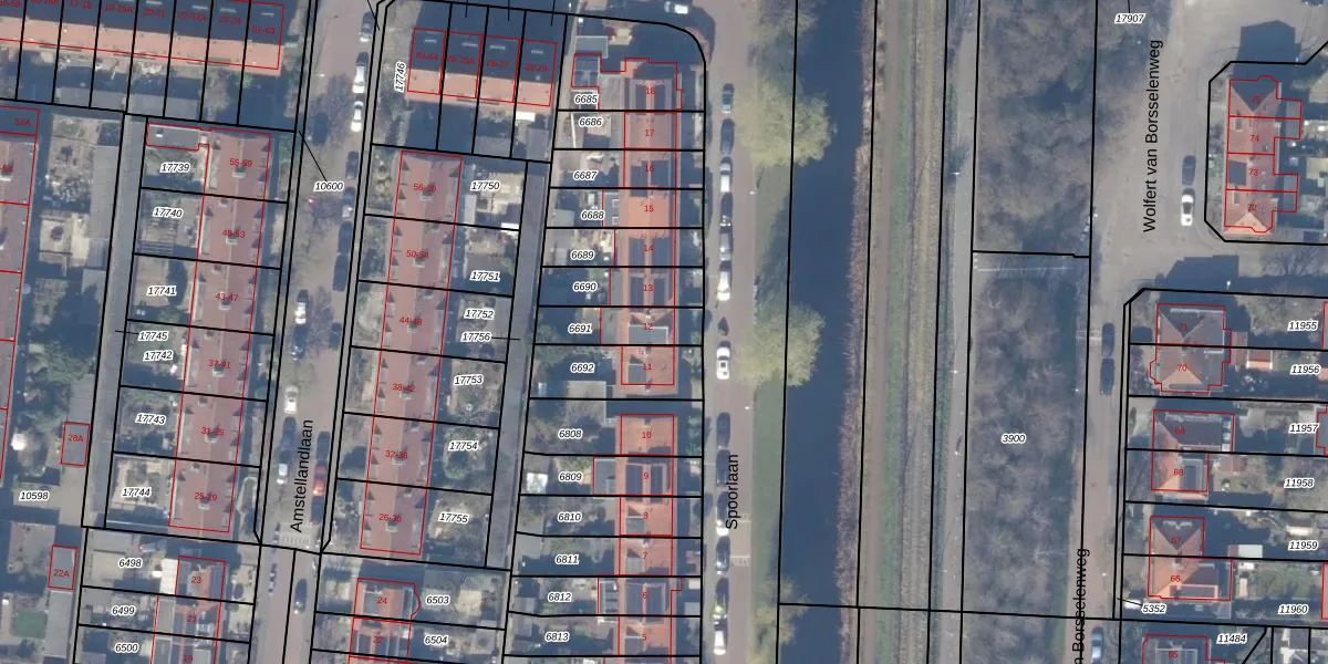 Spoorlaan 12 is gelegen op kadastraal perceel ASV00H6691. Deze kadastrale aanduiding is uniek en wordt gebruikt door het Kadaster om eigendomsrechten en andere zakelijke rechten vast te leggen. Het perceel maakt onderdeel uit van de kadastrale gemeente Amstelveen.