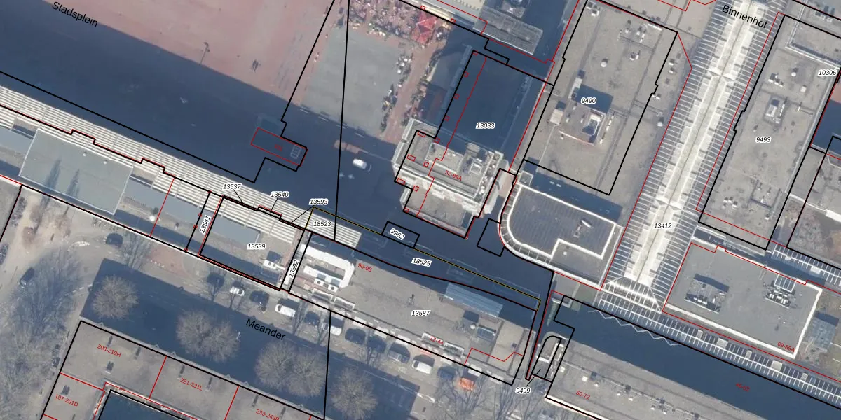 Het perceel waarop Stadsplein 89 staat heeft een oppervlakte van 865 m². Dit is een groot perceel. De perceeloppervlakte wordt geregistreerd door het Kadaster. Gedetailleerde informatie over de maten van dit perceel kunt u vinden in het rapport Kadastrale kaart met maatvoering van Stadsplein 89.