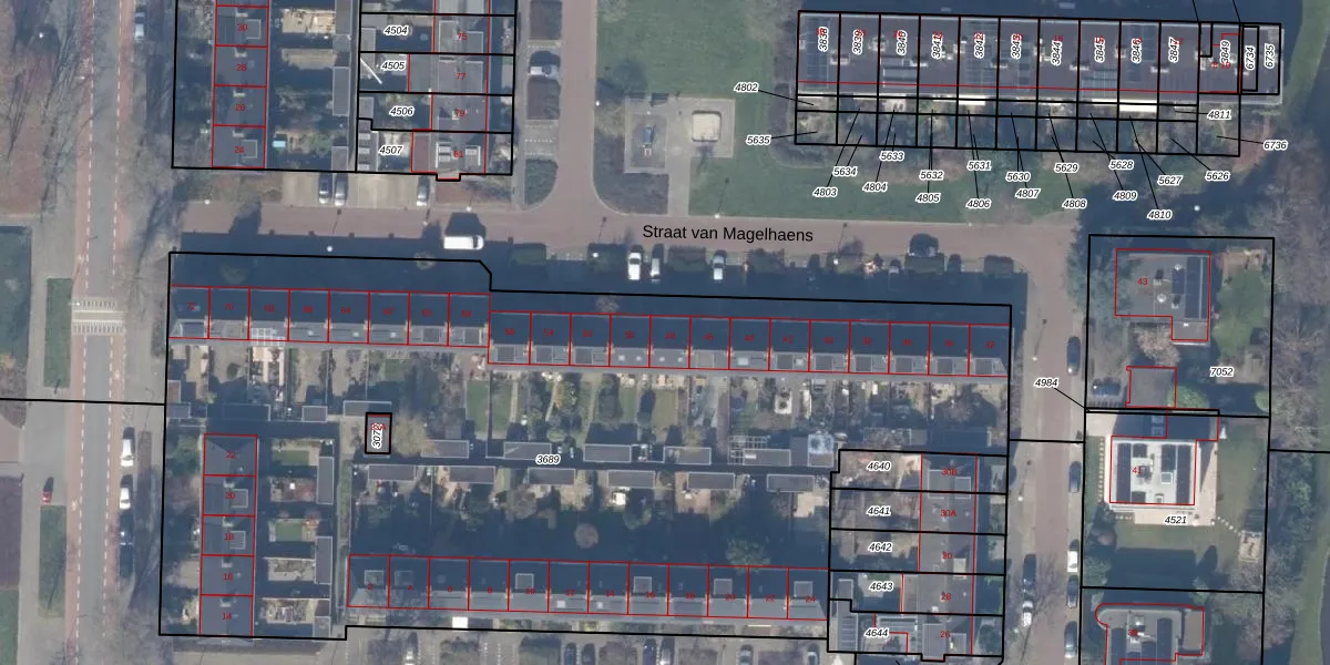 Het perceel waarop Straat van Magelhaens 48 staat heeft een oppervlakte van 5962 m². Dit is een zeer groot perceel. De perceeloppervlakte wordt geregistreerd door het Kadaster. Gedetailleerde informatie over de maten van dit perceel kunt u vinden in het rapport Kadastrale kaart met maatvoering van Straat van Magelhaens 48.