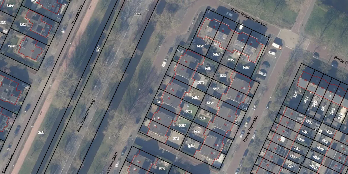 Suze Robertsonlaan 16 is gelegen op kadastraal perceel ASV00O7317. Deze kadastrale aanduiding is uniek en wordt gebruikt door het Kadaster om eigendomsrechten en andere zakelijke rechten vast te leggen. Het perceel maakt onderdeel uit van de kadastrale gemeente Amstelveen.