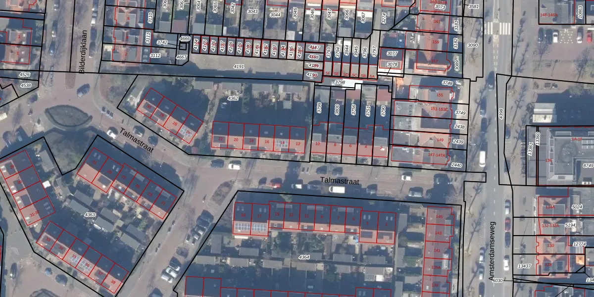 Talmastraat 12 is gelegen op kadastraal perceel ASV00G4362. Deze kadastrale aanduiding is uniek en wordt gebruikt door het Kadaster om eigendomsrechten en andere zakelijke rechten vast te leggen. Het perceel maakt onderdeel uit van de kadastrale gemeente Amstelveen.
