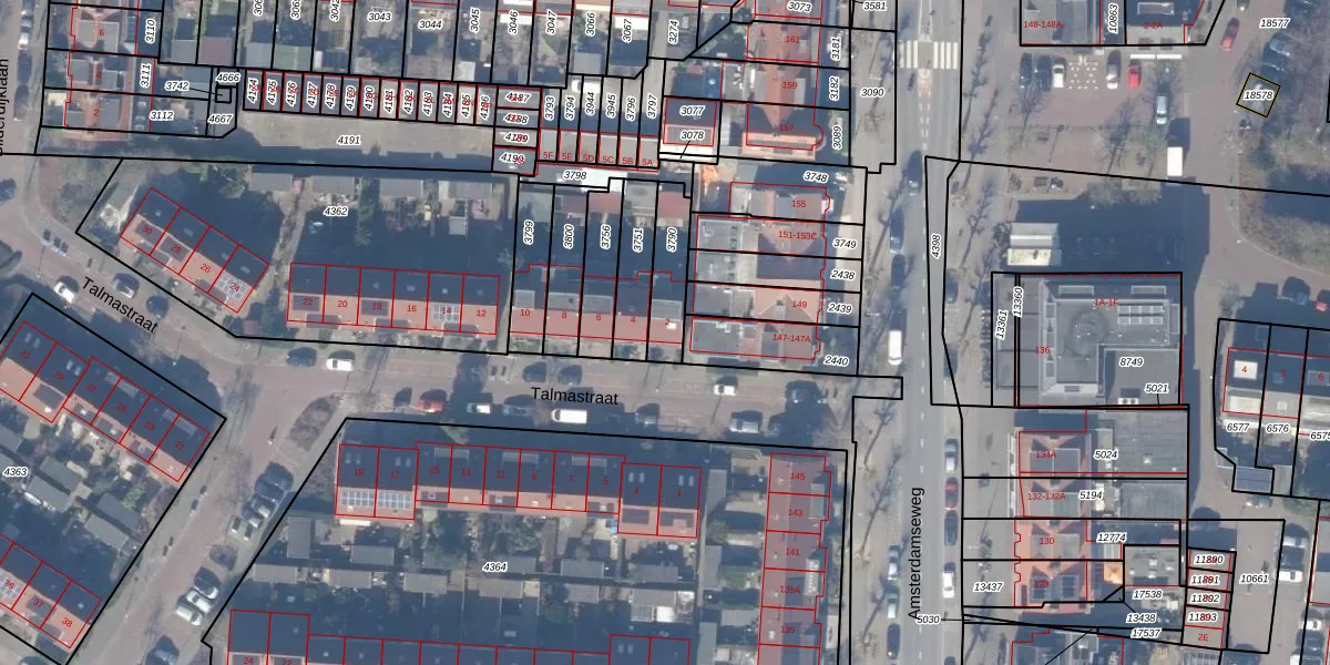 Talmastraat 2 is gelegen op kadastraal perceel ASV00G3790. Deze kadastrale aanduiding is uniek en wordt gebruikt door het Kadaster om eigendomsrechten en andere zakelijke rechten vast te leggen. Het perceel maakt onderdeel uit van de kadastrale gemeente Amstelveen.