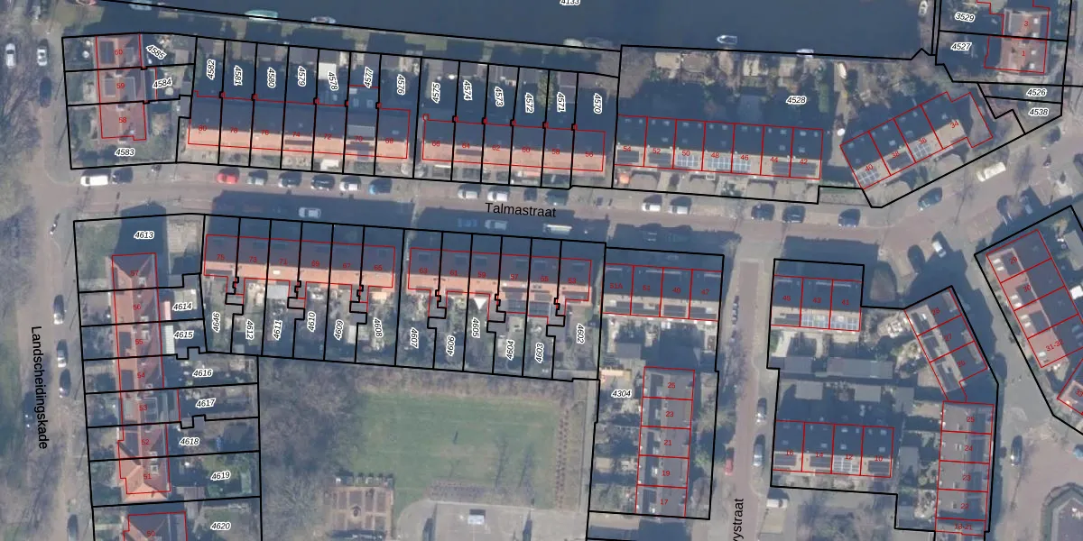 Talmastraat 55 is gelegen op kadastraal perceel ASV00G4603. Deze kadastrale aanduiding is uniek en wordt gebruikt door het Kadaster om eigendomsrechten en andere zakelijke rechten vast te leggen. Het perceel maakt onderdeel uit van de kadastrale gemeente Amstelveen.
