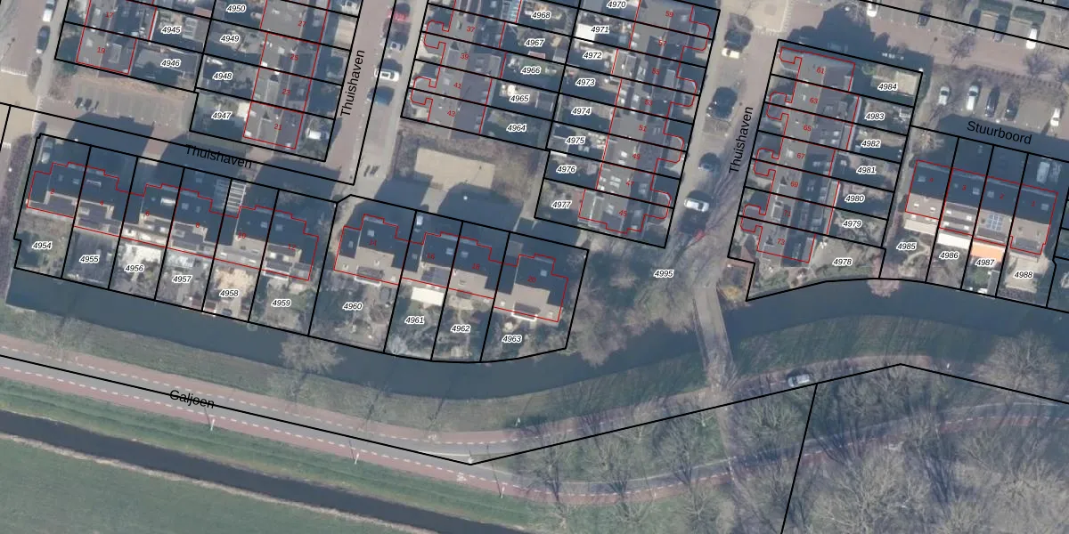 Het perceel waarop Thuishaven 20 staat heeft een oppervlakte van 335 m². Dit is een groot perceel. De perceeloppervlakte wordt geregistreerd door het Kadaster. Gedetailleerde informatie over de maten van dit perceel kunt u vinden in het rapport Kadastrale kaart met maatvoering van Thuishaven 20.