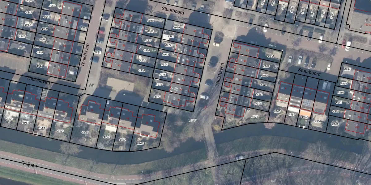 Thuishaven 47 is gelegen op kadastraal perceel ASV00M4976. Deze kadastrale aanduiding is uniek en wordt gebruikt door het Kadaster om eigendomsrechten en andere zakelijke rechten vast te leggen. Het perceel maakt onderdeel uit van de kadastrale gemeente Amstelveen.