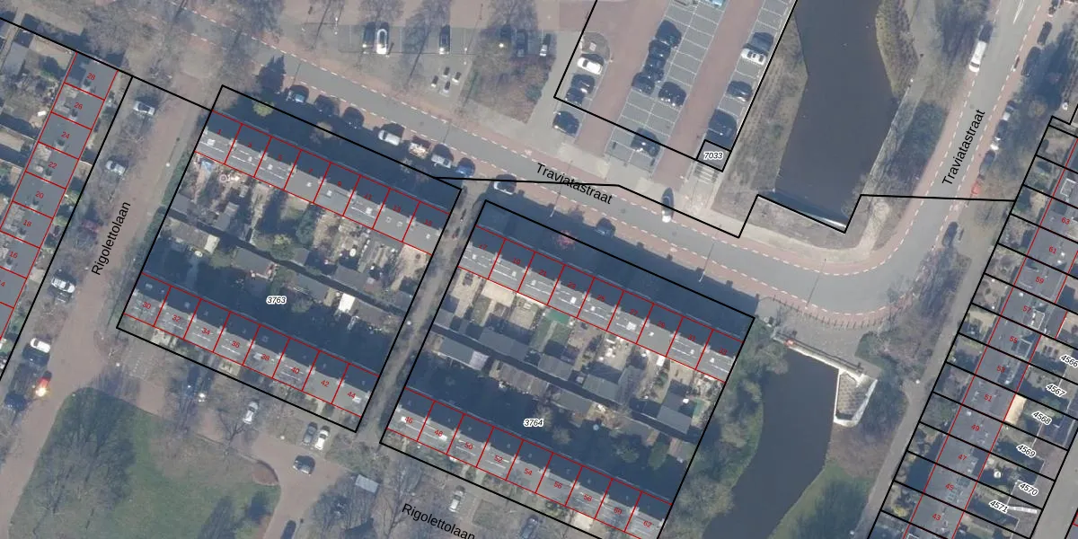Traviatastraat 21 is gelegen op kadastraal perceel ASV00I3764. Deze kadastrale aanduiding is uniek en wordt gebruikt door het Kadaster om eigendomsrechten en andere zakelijke rechten vast te leggen. Het perceel maakt onderdeel uit van de kadastrale gemeente Amstelveen.
