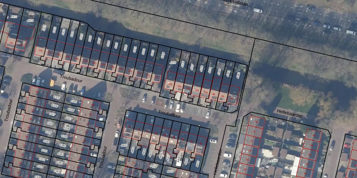 Het perceel waarop Troubadour 106 staat heeft een oppervlakte van 144 m². Dit is een middelgroot perceel. De perceeloppervlakte wordt geregistreerd door het Kadaster. Gedetailleerde informatie over de maten van dit perceel kunt u vinden in het rapport Kadastrale kaart met maatvoering van Troubadour 106.