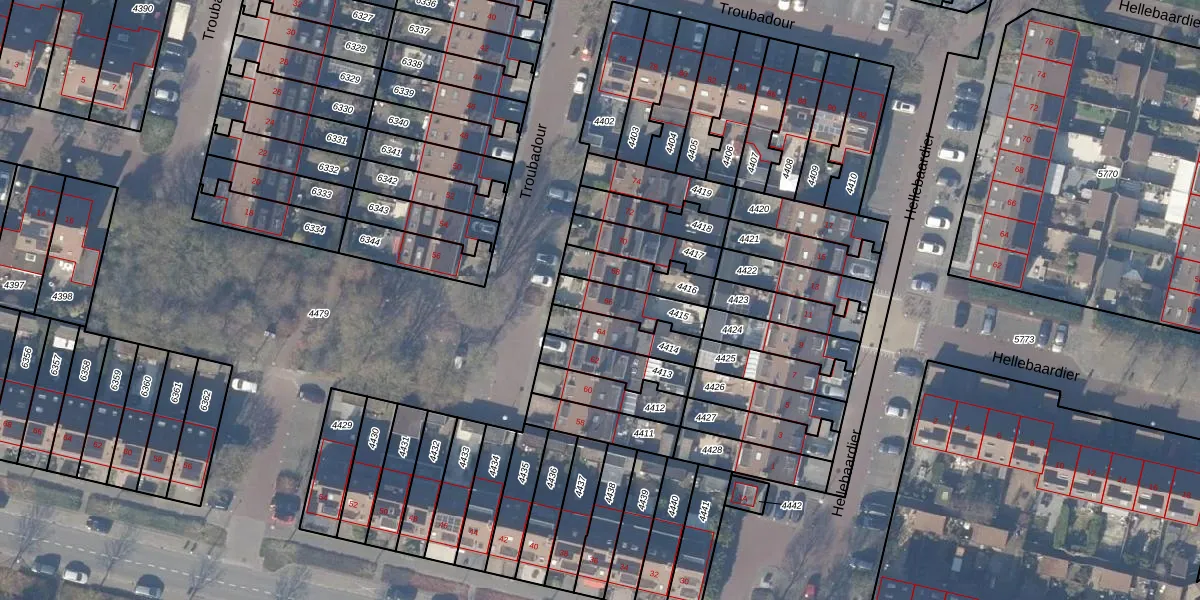 Het perceel waarop Troubadour 66 staat heeft een oppervlakte van 130 m². Dit is een middelgroot perceel. De perceeloppervlakte wordt geregistreerd door het Kadaster. Gedetailleerde informatie over de maten van dit perceel kunt u vinden in het rapport Kadastrale kaart met maatvoering van Troubadour 66.