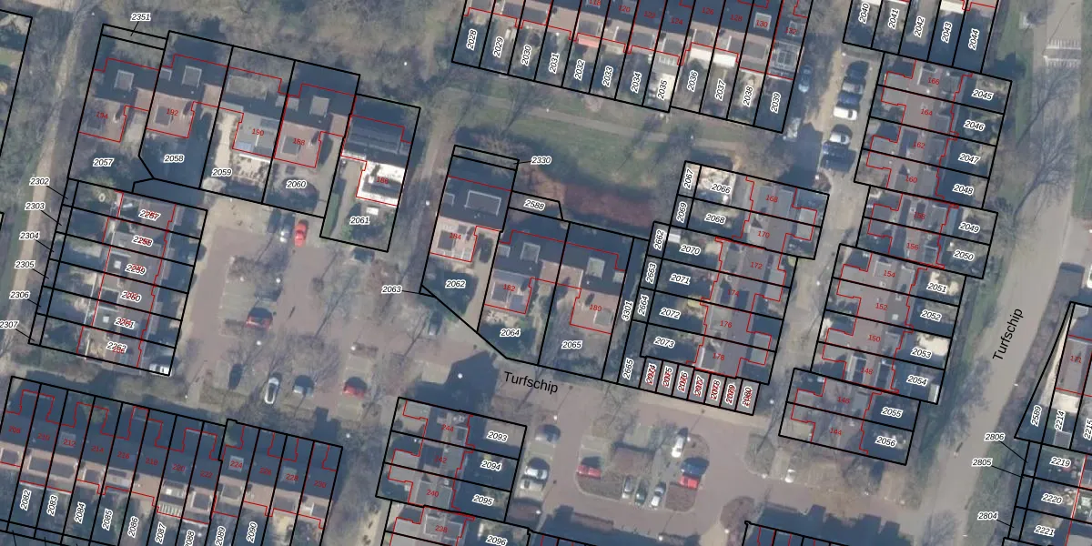 Het perceel waarop Turfschip 182 staat heeft een oppervlakte van 313 m². Dit is een groot perceel. De perceeloppervlakte wordt geregistreerd door het Kadaster. Gedetailleerde informatie over de maten van dit perceel kunt u vinden in het rapport Kadastrale kaart met maatvoering van Turfschip 182.