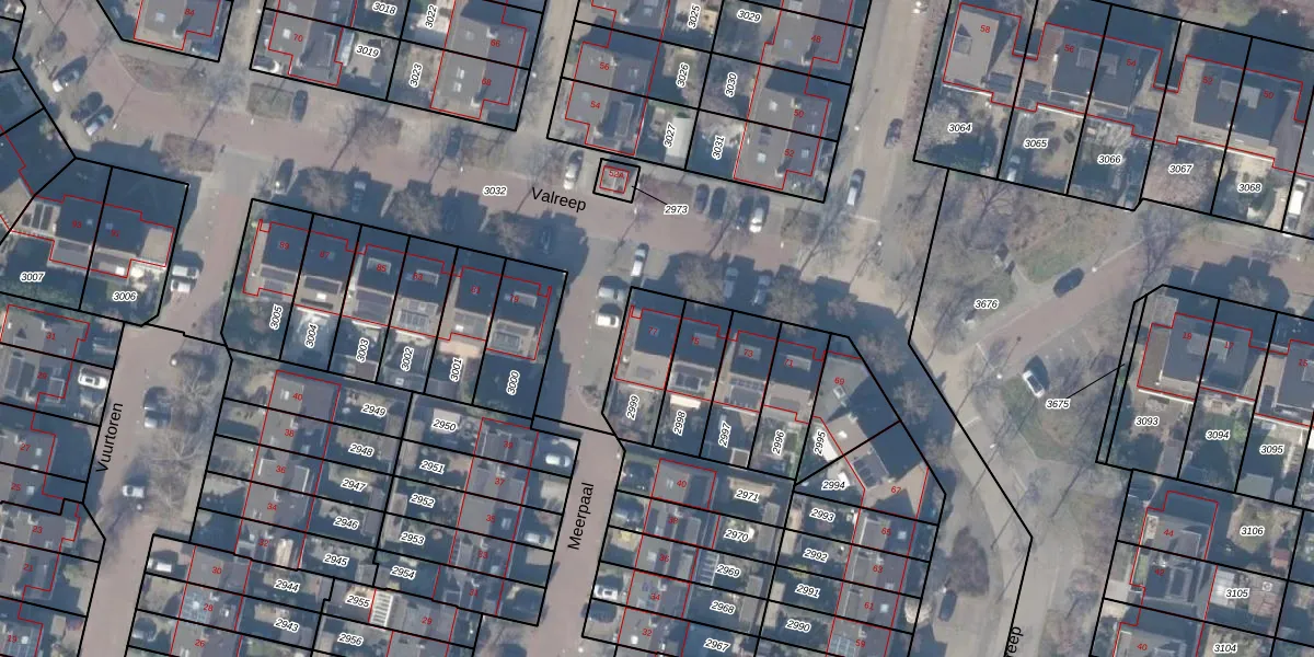 Het perceel waarop Valreep 77 staat heeft een oppervlakte van 188 m². Dit is een middelgroot perceel. De perceeloppervlakte wordt geregistreerd door het Kadaster. Gedetailleerde informatie over de maten van dit perceel kunt u vinden in het rapport Kadastrale kaart met maatvoering van Valreep 77.