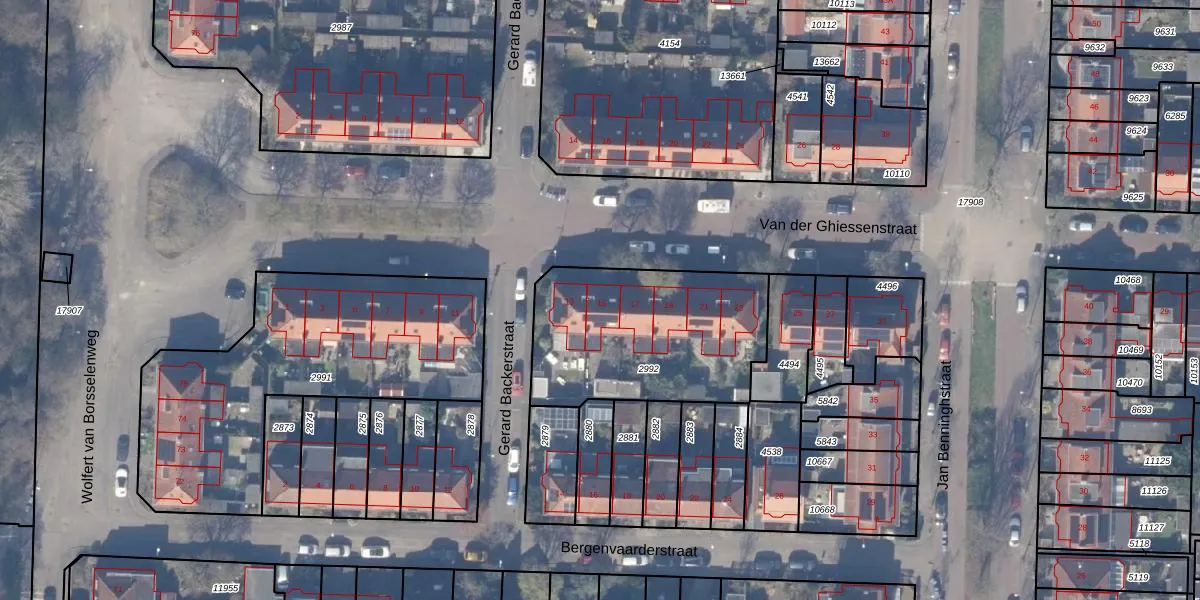 Het perceel waarop Van der Ghiessenstraat 15 staat heeft een oppervlakte van 850 m². Dit is een groot perceel. De perceeloppervlakte wordt geregistreerd door het Kadaster. Gedetailleerde informatie over de maten van dit perceel kunt u vinden in het rapport Kadastrale kaart met maatvoering van Van der Ghiessenstraat 15.
