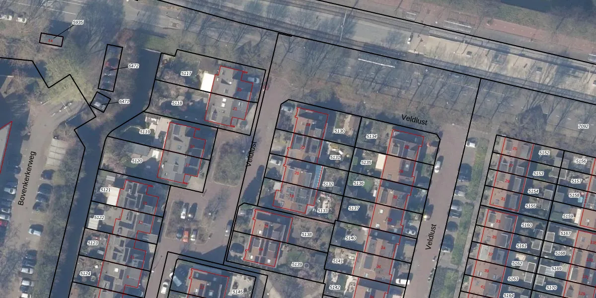Veldlust 22 is gelegen op kadastraal perceel ASV00M5131. Deze kadastrale aanduiding is uniek en wordt gebruikt door het Kadaster om eigendomsrechten en andere zakelijke rechten vast te leggen. Het perceel maakt onderdeel uit van de kadastrale gemeente Amstelveen.