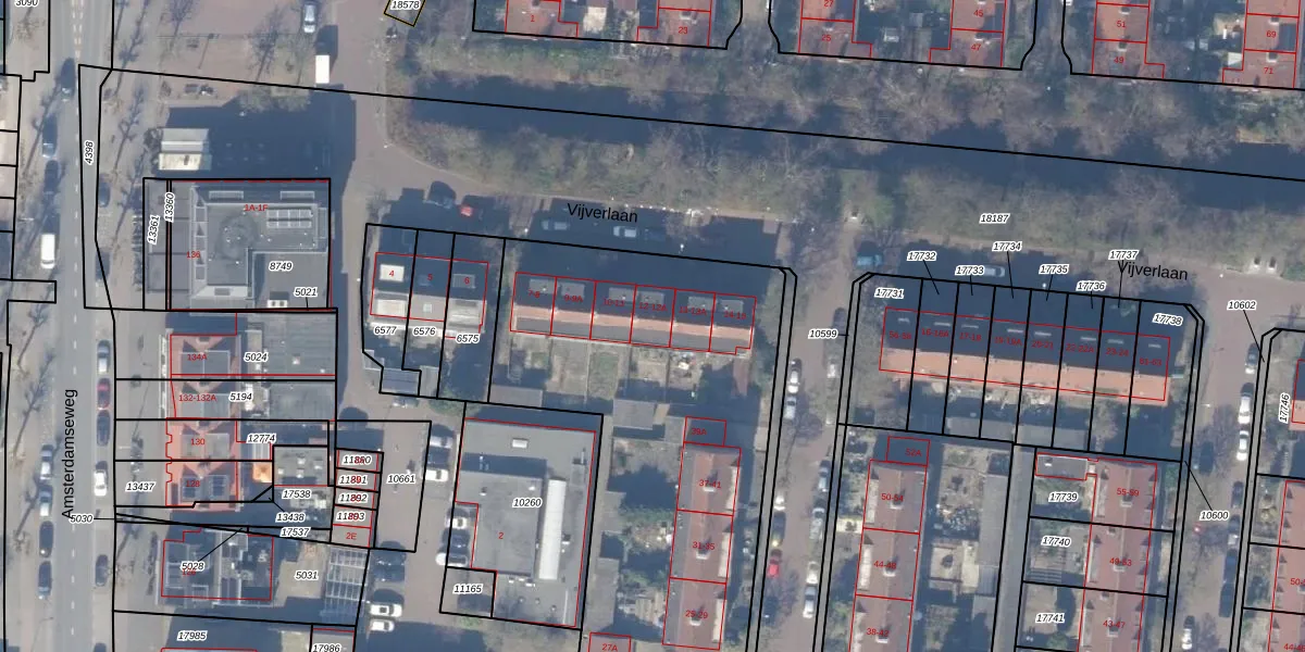 Vijverlaan 12-A is gelegen op kadastraal perceel ASV00H10596. Deze kadastrale aanduiding is uniek en wordt gebruikt door het Kadaster om eigendomsrechten en andere zakelijke rechten vast te leggen. Het perceel maakt onderdeel uit van de kadastrale gemeente Amstelveen.