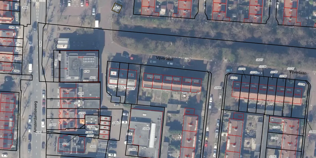 Vijverlaan 9 is gelegen op kadastraal perceel ASV00H10596. Deze kadastrale aanduiding is uniek en wordt gebruikt door het Kadaster om eigendomsrechten en andere zakelijke rechten vast te leggen. Het perceel maakt onderdeel uit van de kadastrale gemeente Amstelveen.
