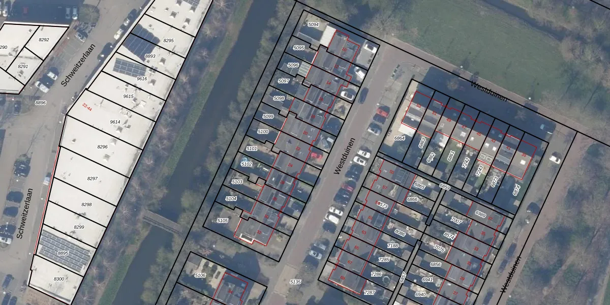 Westduinen 22 is gelegen op kadastraal perceel ASV00O5100. Deze kadastrale aanduiding is uniek en wordt gebruikt door het Kadaster om eigendomsrechten en andere zakelijke rechten vast te leggen. Het perceel maakt onderdeel uit van de kadastrale gemeente Amstelveen.