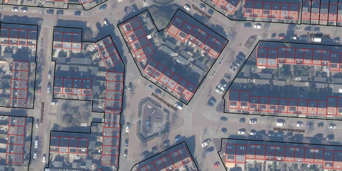 Wilhelminaplein 36 is gelegen op kadastraal perceel ASV00G4363. Deze kadastrale aanduiding is uniek en wordt gebruikt door het Kadaster om eigendomsrechten en andere zakelijke rechten vast te leggen. Het perceel maakt onderdeel uit van de kadastrale gemeente Amstelveen.