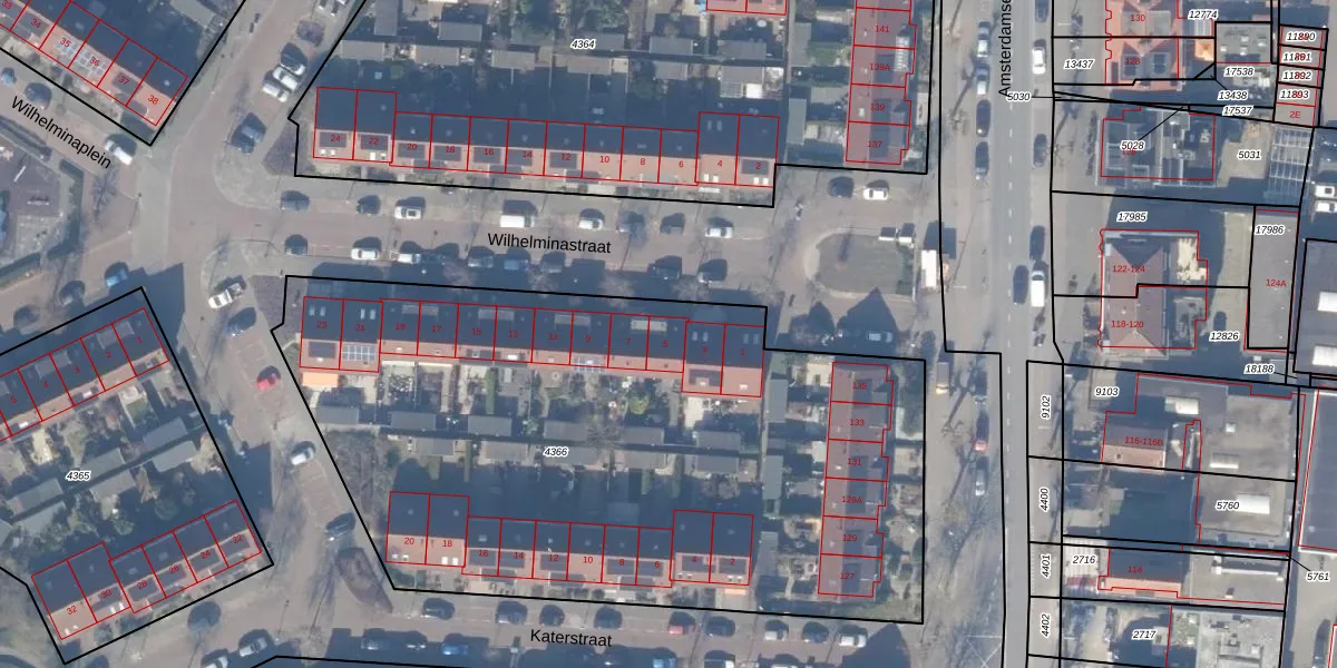 Wilhelminastraat 5 is gelegen op kadastraal perceel ASV00G4366. Deze kadastrale aanduiding is uniek en wordt gebruikt door het Kadaster om eigendomsrechten en andere zakelijke rechten vast te leggen. Het perceel maakt onderdeel uit van de kadastrale gemeente Amstelveen.