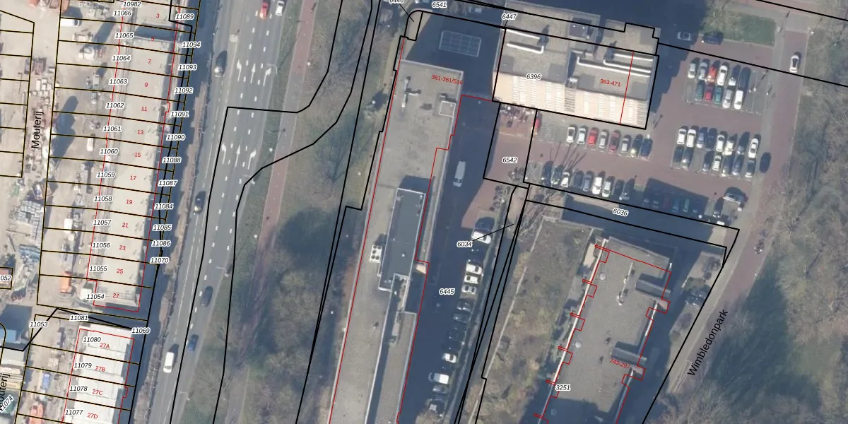 Wimbledonpark 361-407 is gelegen op kadastraal perceel ASV00M6445. Deze kadastrale aanduiding is uniek en wordt gebruikt door het Kadaster om eigendomsrechten en andere zakelijke rechten vast te leggen. Het perceel maakt onderdeel uit van de kadastrale gemeente Amstelveen.