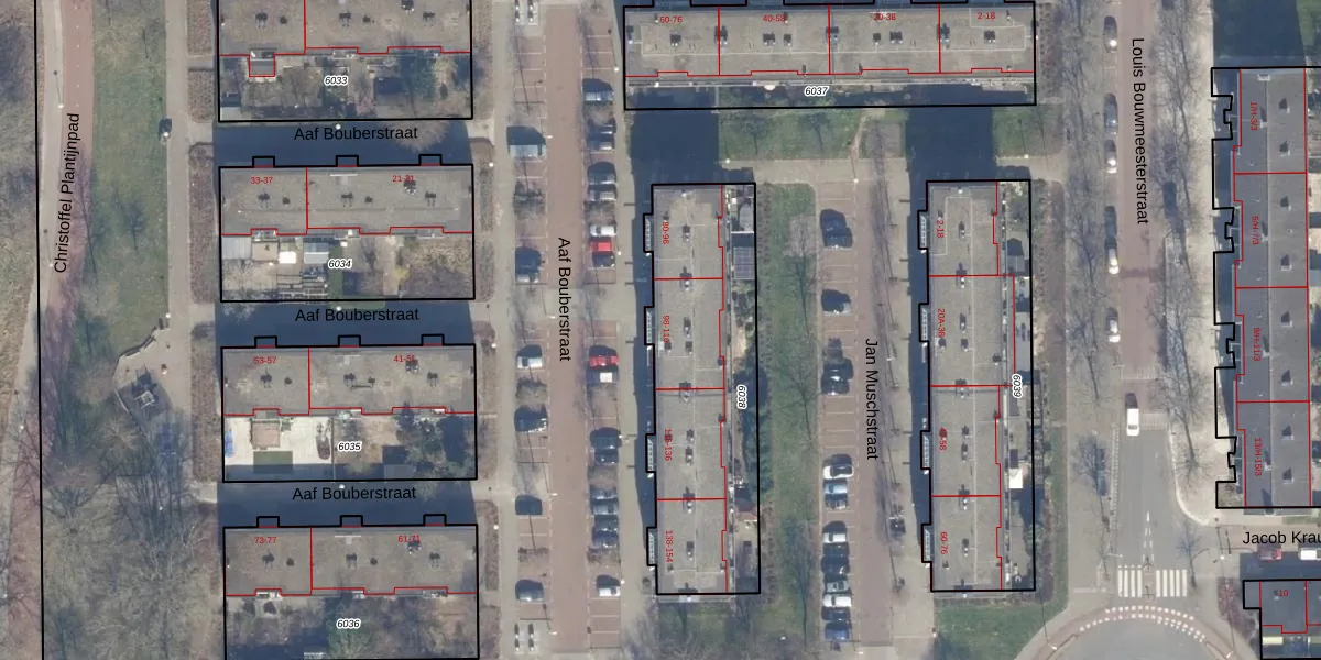 Het perceel waarop Aaf Bouberstraat 104 staat heeft een oppervlakte van 998 m². Dit is een groot perceel. De perceeloppervlakte wordt geregistreerd door het Kadaster. Gedetailleerde informatie over de maten van dit perceel kunt u vinden in het rapport Kadastrale kaart met maatvoering van Aaf Bouberstraat 104.