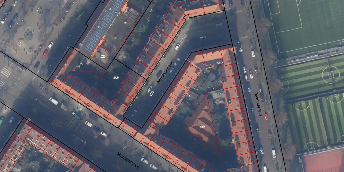 Het perceel waarop Achillesstraat 25-H staat heeft een oppervlakte van 3907 m². Dit is een zeer groot perceel. De perceeloppervlakte wordt geregistreerd door het Kadaster. Gedetailleerde informatie over de maten van dit perceel kunt u vinden in het rapport Kadastrale kaart met maatvoering van Achillesstraat 25-H.