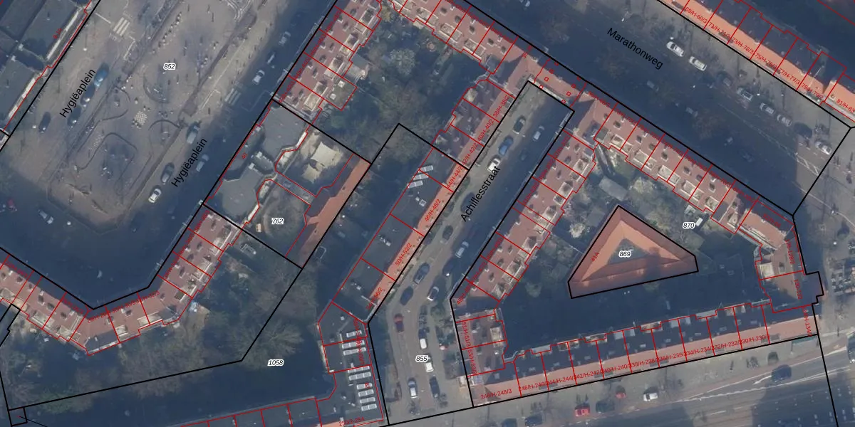 Het perceel waarop Achillesstraat 48-H staat heeft een oppervlakte van 3021 m². Dit is een zeer groot perceel. De perceeloppervlakte wordt geregistreerd door het Kadaster. Gedetailleerde informatie over de maten van dit perceel kunt u vinden in het rapport Kadastrale kaart met maatvoering van Achillesstraat 48-H.
