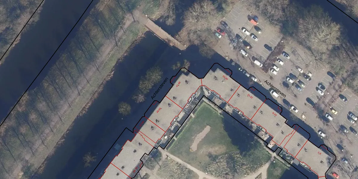 Het perceel waarop Achtersteven 46 staat heeft een oppervlakte van 1,0 ha. Dit is een zeer groot perceel. De perceeloppervlakte wordt geregistreerd door het Kadaster. Gedetailleerde informatie over de maten van dit perceel kunt u vinden in het rapport Kadastrale kaart met maatvoering van Achtersteven 46.