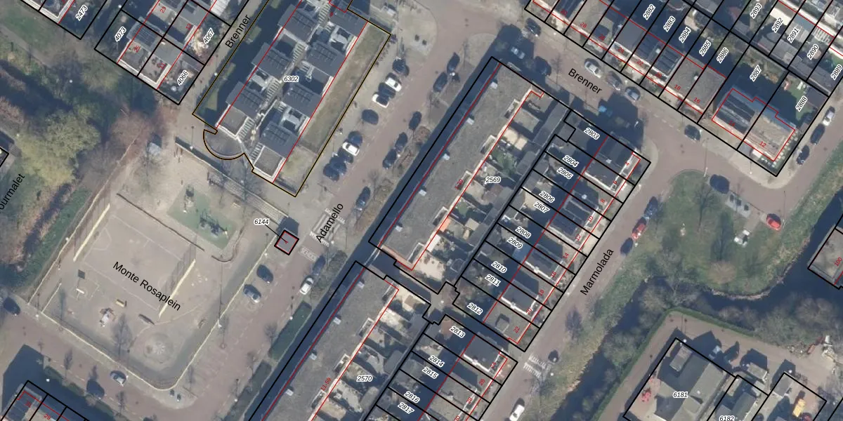 Het perceel waarop Adamello 35 staat heeft een oppervlakte van 1222 m². Dit is een zeer groot perceel. De perceeloppervlakte wordt geregistreerd door het Kadaster. Gedetailleerde informatie over de maten van dit perceel kunt u vinden in het rapport Kadastrale kaart met maatvoering van Adamello 35.