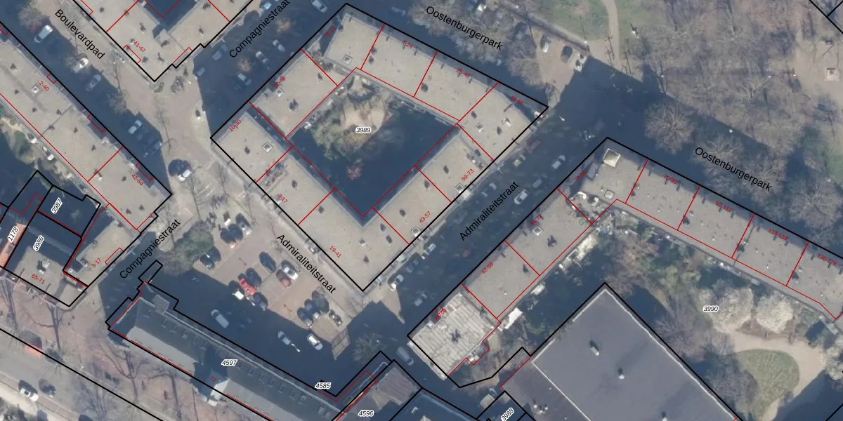 Het perceel waarop Admiraliteitstraat 53 staat heeft een oppervlakte van 2753 m². Dit is een zeer groot perceel. De perceeloppervlakte wordt geregistreerd door het Kadaster. Gedetailleerde informatie over de maten van dit perceel kunt u vinden in het rapport Kadastrale kaart met maatvoering van Admiraliteitstraat 53.