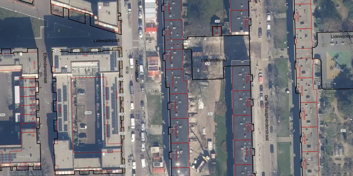 Het perceel waarop Akbarstraat 54-2 staat heeft een oppervlakte van 7901 m². Dit is een zeer groot perceel. De perceeloppervlakte wordt geregistreerd door het Kadaster. Gedetailleerde informatie over de maten van dit perceel kunt u vinden in het rapport Kadastrale kaart met maatvoering van Akbarstraat 54-2.