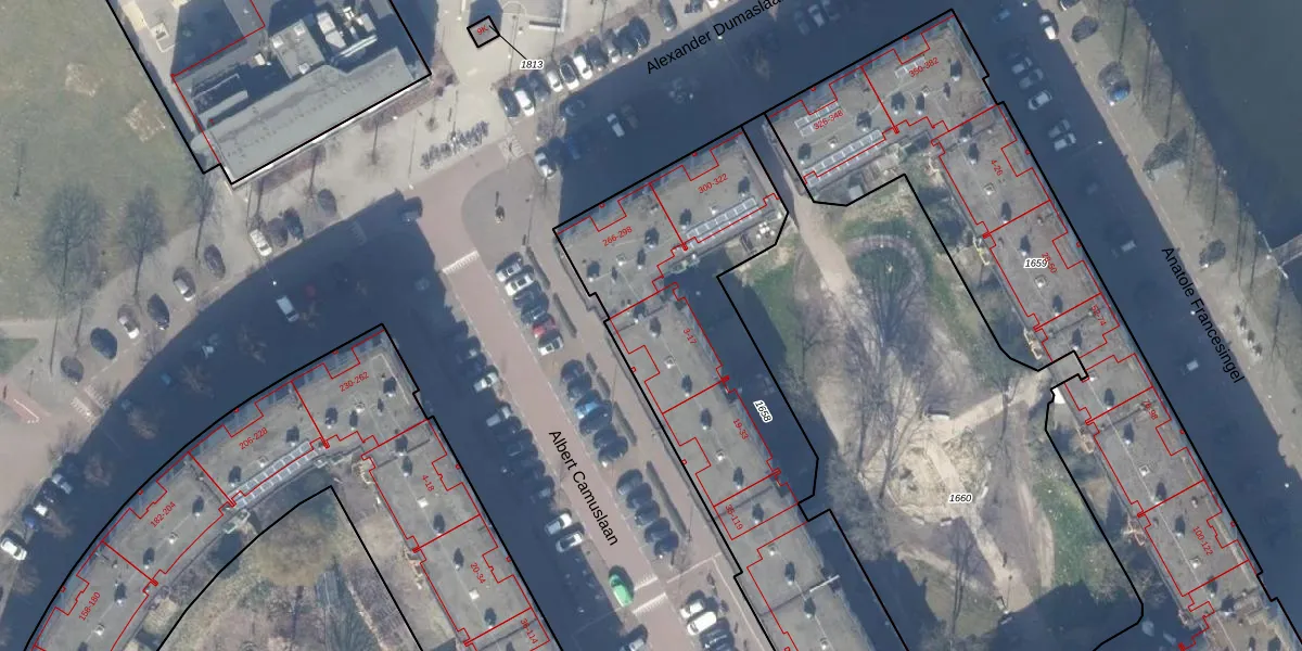 Het perceel waarop Albert Camuslaan 15 staat heeft een oppervlakte van 2613 m². Dit is een zeer groot perceel. De perceeloppervlakte wordt geregistreerd door het Kadaster. Gedetailleerde informatie over de maten van dit perceel kunt u vinden in het rapport Kadastrale kaart met maatvoering van Albert Camuslaan 15.