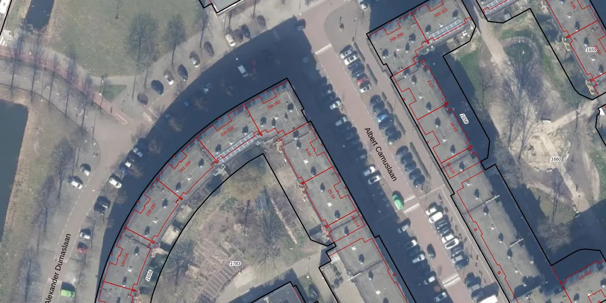 Het perceel waarop Albert Camuslaan 6 staat heeft een oppervlakte van 6425 m². Dit is een zeer groot perceel. De perceeloppervlakte wordt geregistreerd door het Kadaster. Gedetailleerde informatie over de maten van dit perceel kunt u vinden in het rapport Kadastrale kaart met maatvoering van Albert Camuslaan 6.