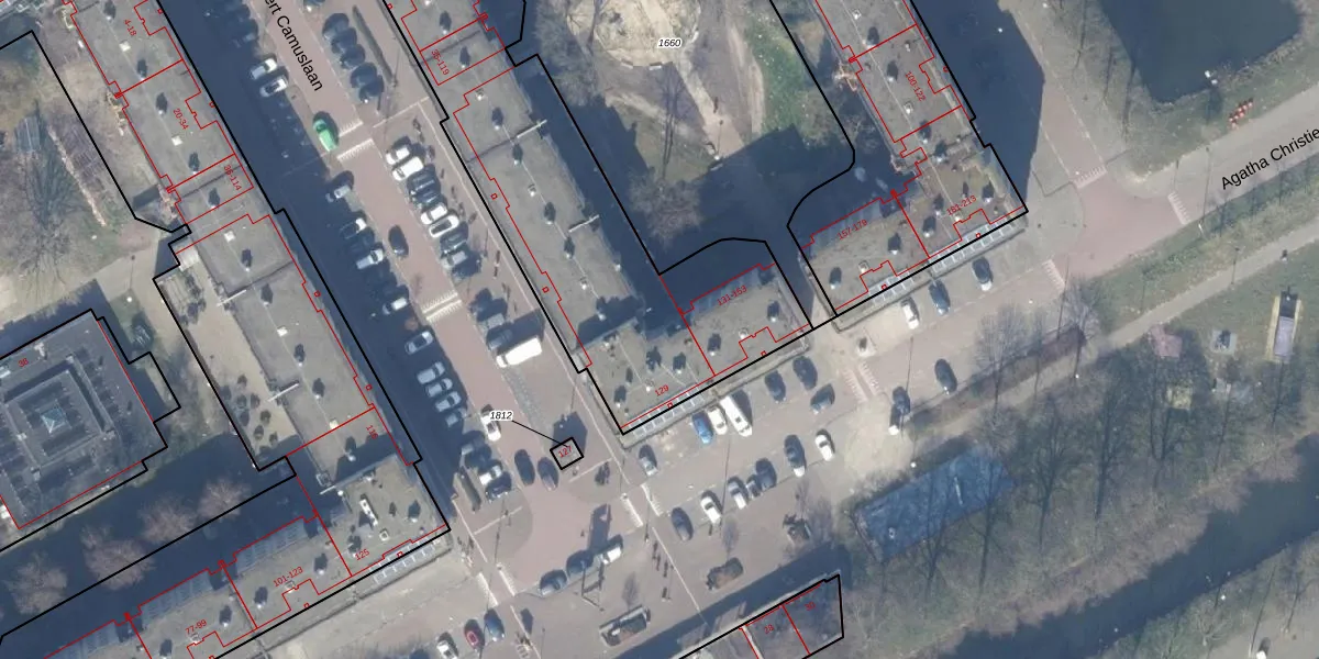 Het perceel waarop Albert Camuslaan 81 staat heeft een oppervlakte van 2613 m². Dit is een zeer groot perceel. De perceeloppervlakte wordt geregistreerd door het Kadaster. Gedetailleerde informatie over de maten van dit perceel kunt u vinden in het rapport Kadastrale kaart met maatvoering van Albert Camuslaan 81.