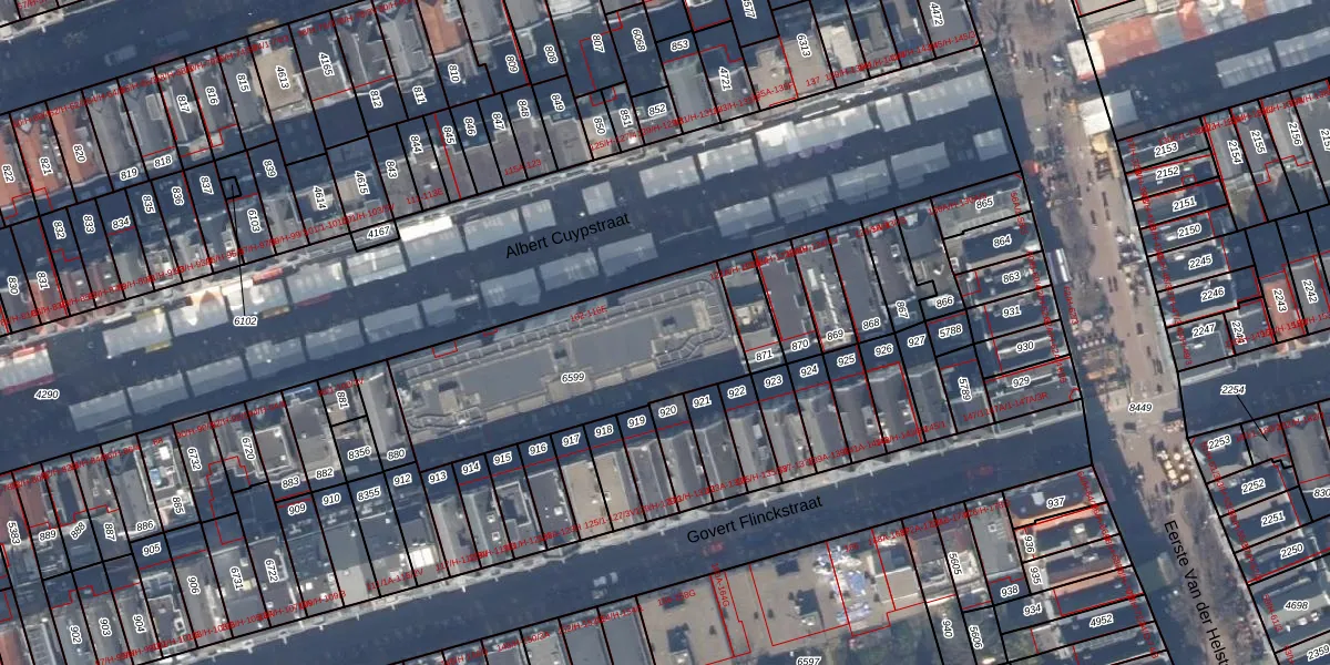 Het perceel waarop Albert Cuypstraat 114-A staat heeft een oppervlakte van 906 m². Dit is een groot perceel. De perceeloppervlakte wordt geregistreerd door het Kadaster. Gedetailleerde informatie over de maten van dit perceel kunt u vinden in het rapport Kadastrale kaart met maatvoering van Albert Cuypstraat 114-A.