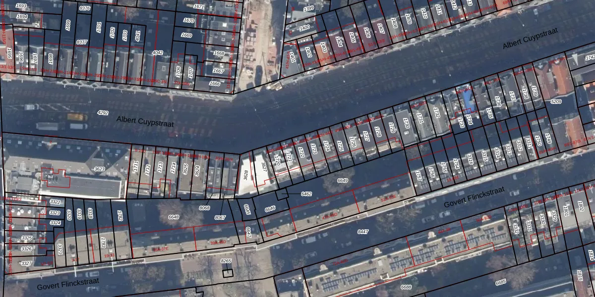 Het perceel waarop Albert Cuypstraat 40-D staat heeft een oppervlakte van 66 m². Dit is een klein perceel. De perceeloppervlakte wordt geregistreerd door het Kadaster. Gedetailleerde informatie over de maten van dit perceel kunt u vinden in het rapport Kadastrale kaart met maatvoering van Albert Cuypstraat 40-D.