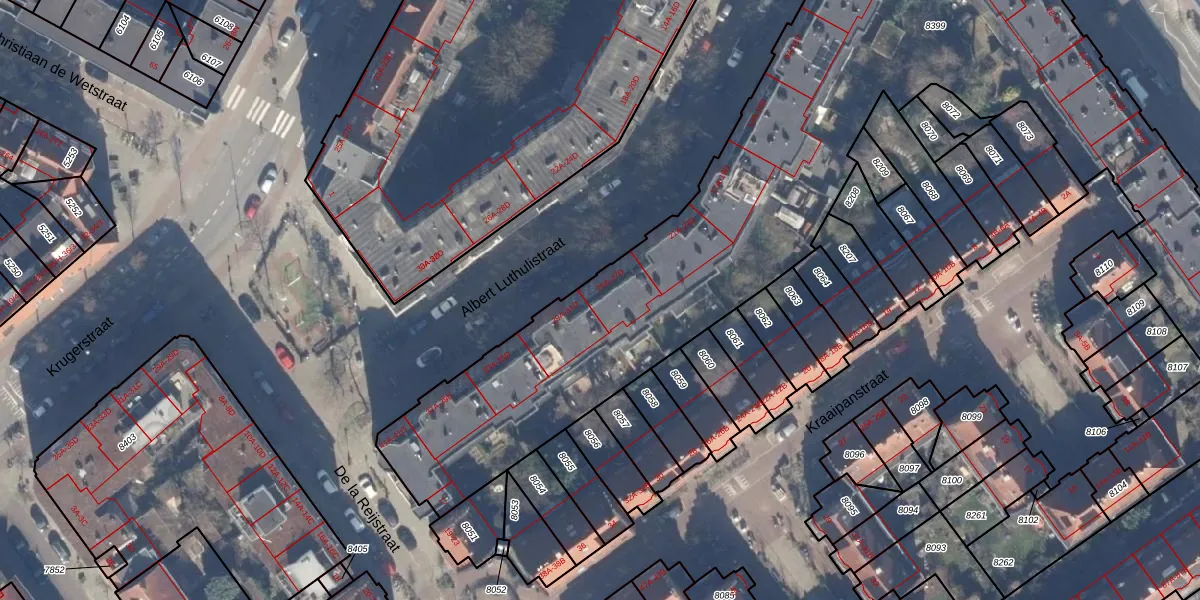 Het adres is gelegen op perceel 8399 in de sectie W en de kadastrale gemeente Amsterdam. De kadastrale aanduiding is aldus ASD19-W-8399. De oppervlakte van het perceel is 4465 m². Dat is groter dan gemiddeld in Amsterdam, waar de gemiddelde perceeloppervlakte op 1563,05 m² ligt. De grootste perceeloppervlakte in de kadastrale gemeente is 17,9 ha. De kleinste oppervlakte bedraagt 0 m². Op het perceel zijn 151 adressen aanwezig. De huidige grenzen van het perceel zijn digitaal in de Basisregistratie Kadaster (BRK) geregistreerd op 03-09-2019.