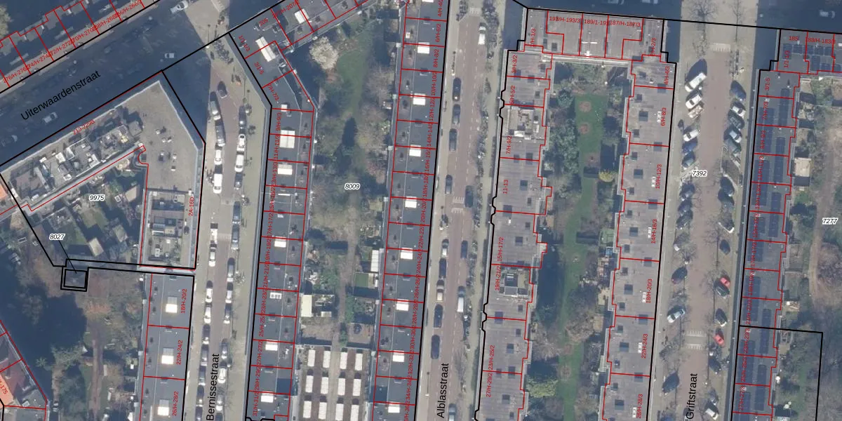 Het perceel waarop Alblasstraat 20-H staat heeft een oppervlakte van 4581 m². Dit is een zeer groot perceel. De perceeloppervlakte wordt geregistreerd door het Kadaster. Gedetailleerde informatie over de maten van dit perceel kunt u vinden in het rapport Kadastrale kaart met maatvoering van Alblasstraat 20-H.