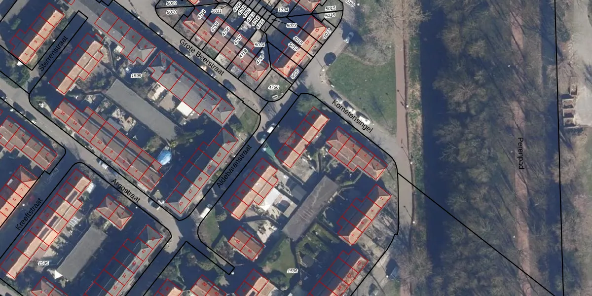 Het perceel waarop Aldebaranstraat 60 staat heeft een oppervlakte van 6051 m². Dit is een zeer groot perceel. De perceeloppervlakte wordt geregistreerd door het Kadaster. Gedetailleerde informatie over de maten van dit perceel kunt u vinden in het rapport Kadastrale kaart met maatvoering van Aldebaranstraat 60.