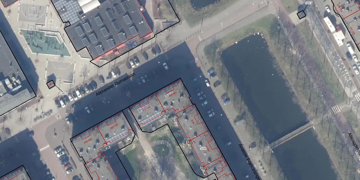 Het perceel waarop Alexander Dumaslaan 372 staat heeft een oppervlakte van 2604 m². Dit is een zeer groot perceel. De perceeloppervlakte wordt geregistreerd door het Kadaster. Gedetailleerde informatie over de maten van dit perceel kunt u vinden in het rapport Kadastrale kaart met maatvoering van Alexander Dumaslaan 372.