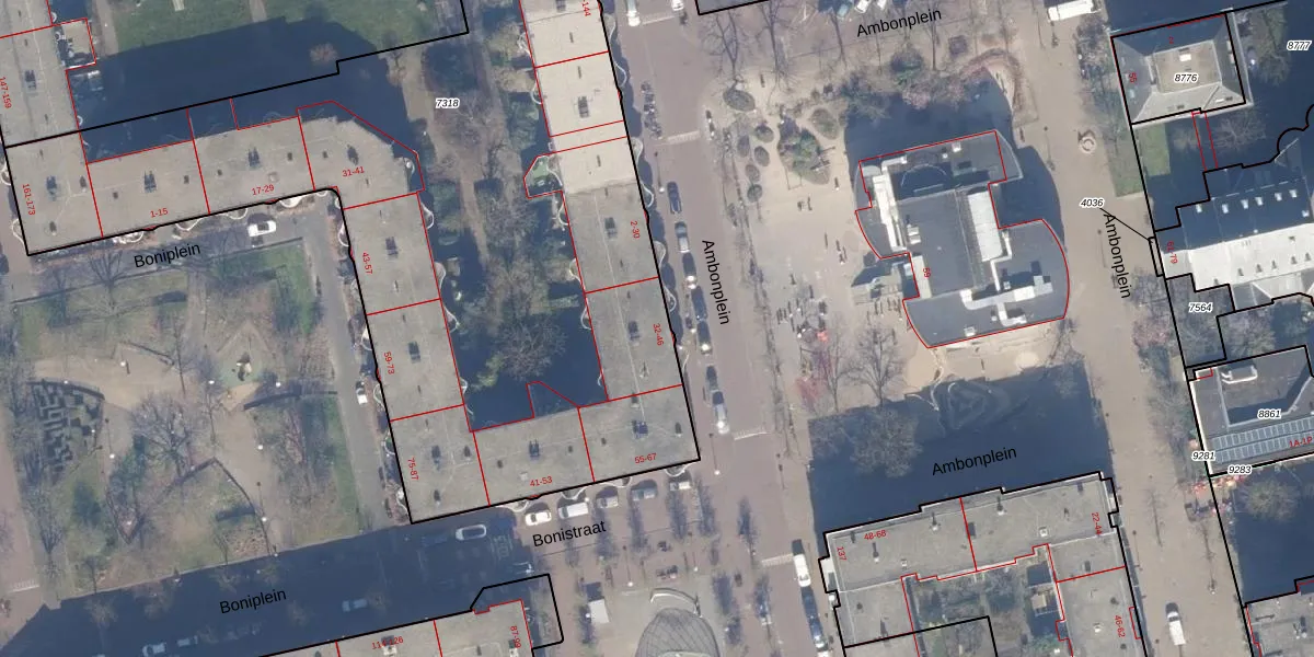 Ambonplein 38 is gelegen op kadastraal perceel ASD19W7318. Deze kadastrale aanduiding is uniek en wordt gebruikt door het Kadaster om eigendomsrechten en andere zakelijke rechten vast te leggen. Het perceel maakt onderdeel uit van de kadastrale gemeente Amsterdam.