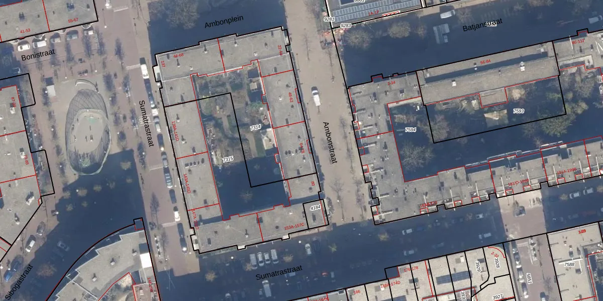 Het perceel waarop Ambonstraat 64 staat heeft een oppervlakte van 1529 m². Dit is een zeer groot perceel. De perceeloppervlakte wordt geregistreerd door het Kadaster. Gedetailleerde informatie over de maten van dit perceel kunt u vinden in het rapport Kadastrale kaart met maatvoering van Ambonstraat 64.