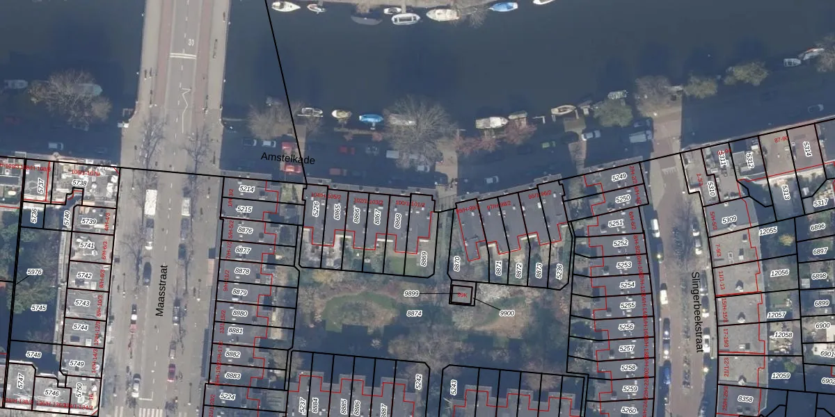Amstelkade 100-1 is gelegen op kadastraal perceel ASD18V8869. Deze kadastrale aanduiding is uniek en wordt gebruikt door het Kadaster om eigendomsrechten en andere zakelijke rechten vast te leggen. Het perceel maakt onderdeel uit van de kadastrale gemeente Amsterdam.