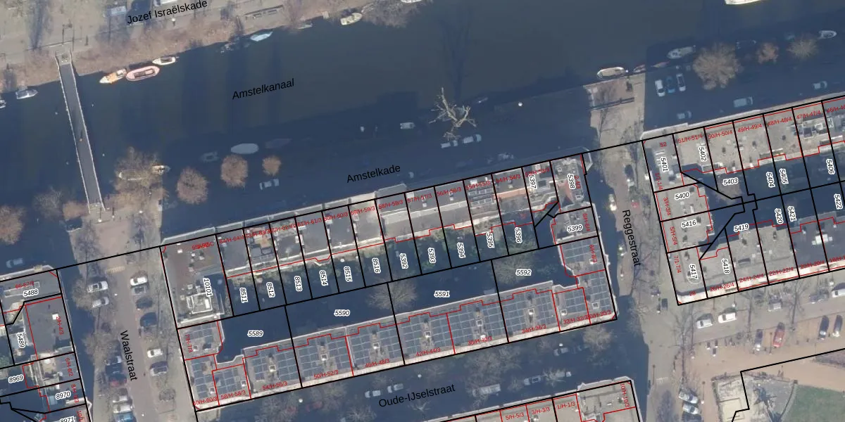 Amstelkade 57-H is gelegen op kadastraal perceel ASD18V5393. Deze kadastrale aanduiding is uniek en wordt gebruikt door het Kadaster om eigendomsrechten en andere zakelijke rechten vast te leggen. Het perceel maakt onderdeel uit van de kadastrale gemeente Amsterdam.