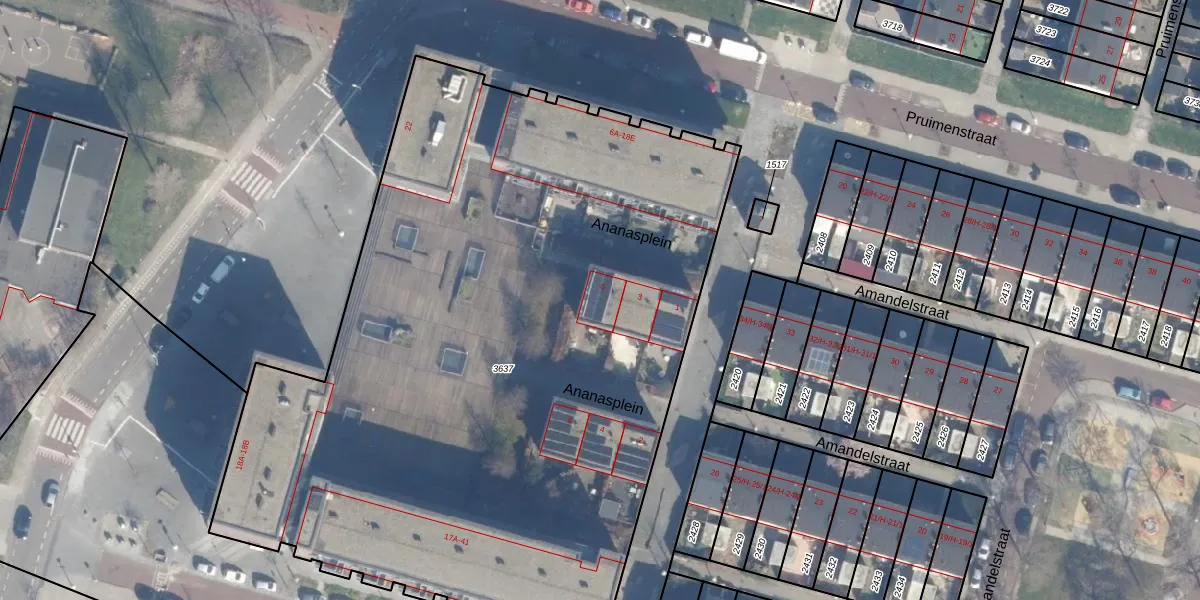 Ananasplein 5 is gelegen op kadastraal perceel ASD28AH3637. Deze kadastrale aanduiding is uniek en wordt gebruikt door het Kadaster om eigendomsrechten en andere zakelijke rechten vast te leggen. Het perceel maakt onderdeel uit van de kadastrale gemeente Amsterdam.