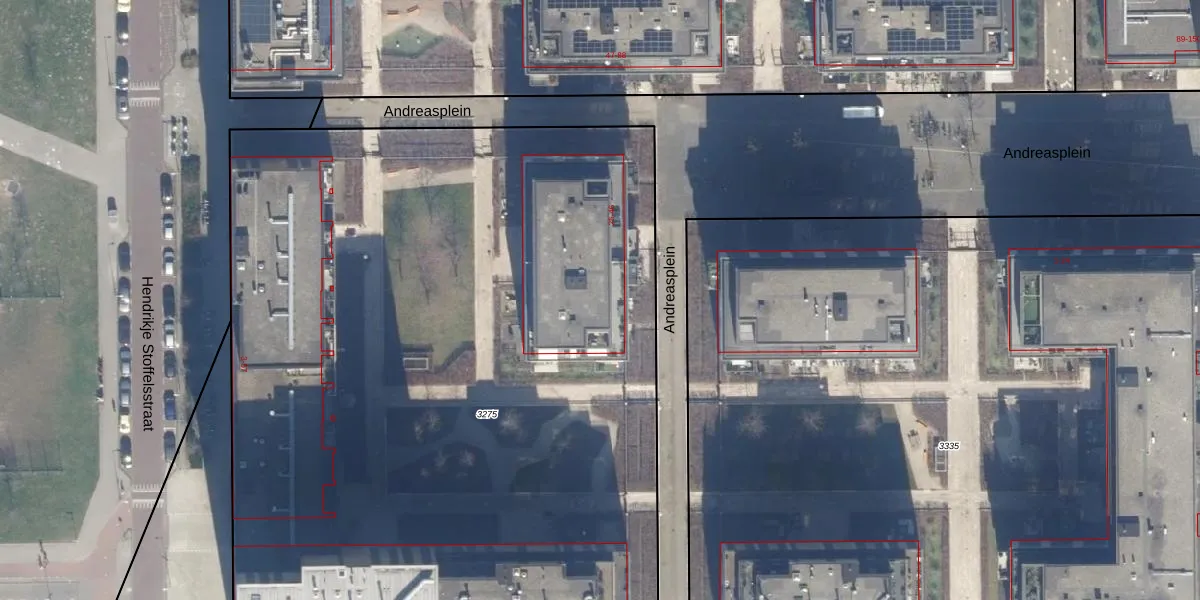 Het perceel waarop Andreasplein 29 staat heeft een oppervlakte van 6327 m². Dit is een zeer groot perceel. De perceeloppervlakte wordt geregistreerd door het Kadaster. Gedetailleerde informatie over de maten van dit perceel kunt u vinden in het rapport Kadastrale kaart met maatvoering van Andreasplein 29.