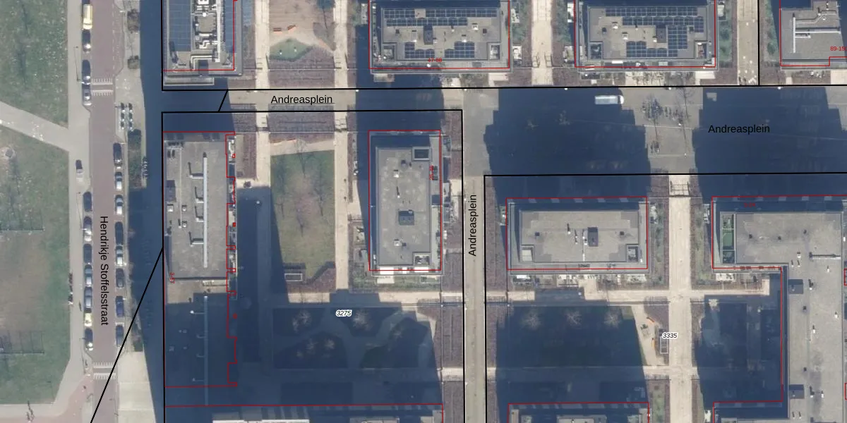 Het perceel waarop Andreasplein 33 staat heeft een oppervlakte van 6327 m². Dit is een zeer groot perceel. De perceeloppervlakte wordt geregistreerd door het Kadaster. Gedetailleerde informatie over de maten van dit perceel kunt u vinden in het rapport Kadastrale kaart met maatvoering van Andreasplein 33.