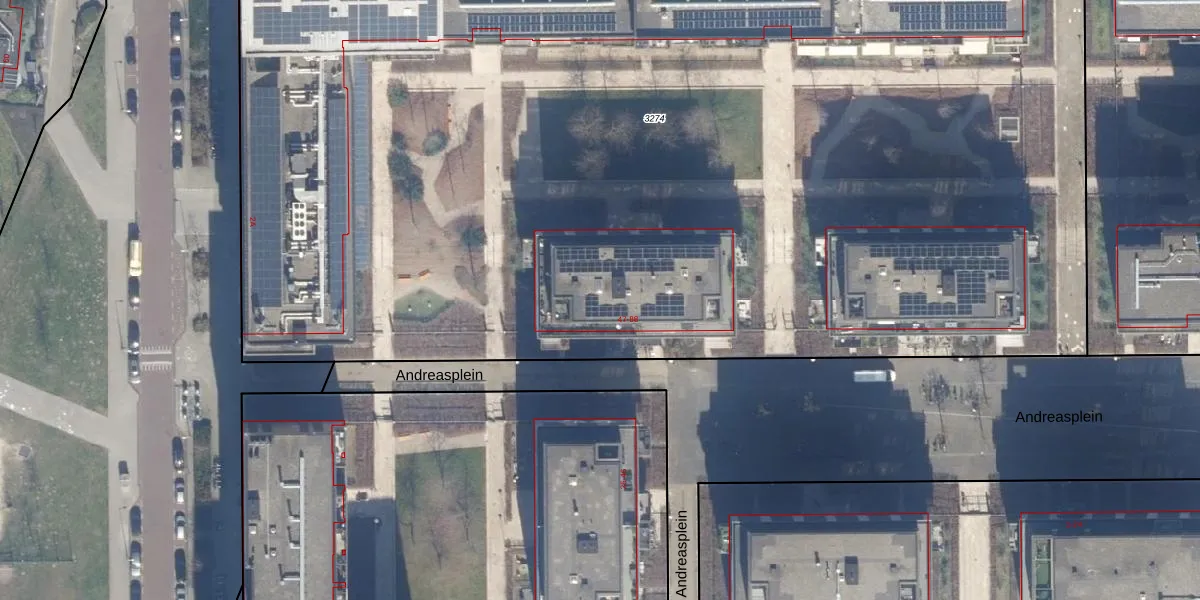 Het perceel waarop Andreasplein 53 staat heeft een oppervlakte van 9895 m². Dit is een zeer groot perceel. De perceeloppervlakte wordt geregistreerd door het Kadaster. Gedetailleerde informatie over de maten van dit perceel kunt u vinden in het rapport Kadastrale kaart met maatvoering van Andreasplein 53.