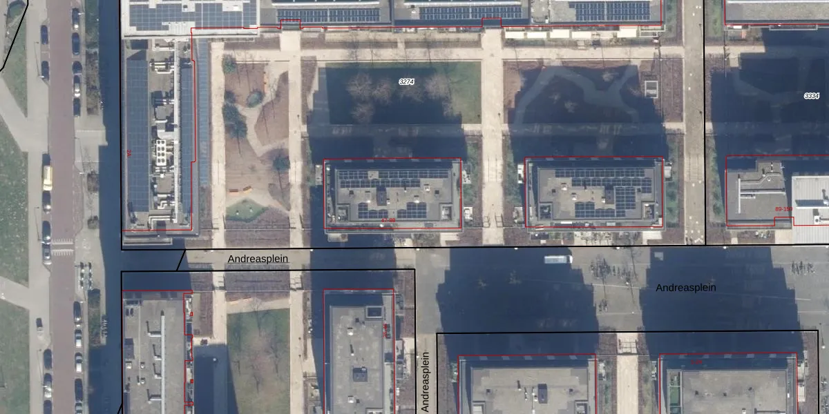 Het perceel waarop Andreasplein 62 staat heeft een oppervlakte van 9895 m². Dit is een zeer groot perceel. De perceeloppervlakte wordt geregistreerd door het Kadaster. Gedetailleerde informatie over de maten van dit perceel kunt u vinden in het rapport Kadastrale kaart met maatvoering van Andreasplein 62.