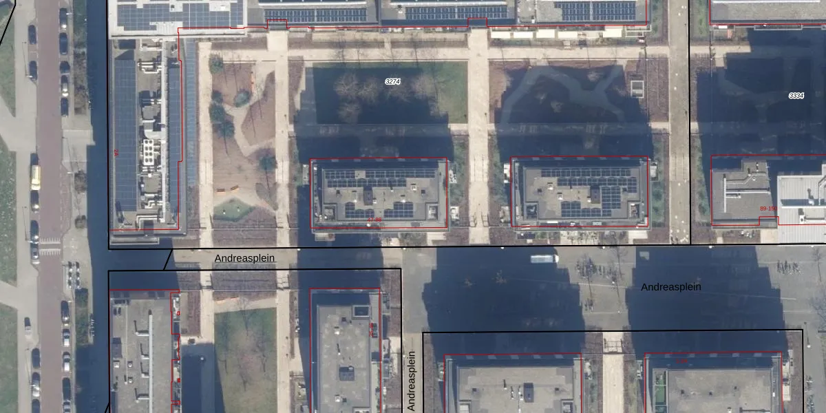 Het perceel waarop Andreasplein 64 staat heeft een oppervlakte van 9895 m². Dit is een zeer groot perceel. De perceeloppervlakte wordt geregistreerd door het Kadaster. Gedetailleerde informatie over de maten van dit perceel kunt u vinden in het rapport Kadastrale kaart met maatvoering van Andreasplein 64.
